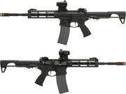 The G&G CM16 Raider L 2.0E AEG - a combat machine airsoft M4 that's new for 2017. This features a longer barrel and PDW style rear stock assembly. New design and configuration featuring M-Lok rail system, full metal gearbox, high quality polymer outer body, flip-up removable front and rear iron sights, PDW metal adjustable stock, and more. The L 2.0E also has a pre-built mosfet unit that is programmable. The inner barrel is 6.01mm upgraded.