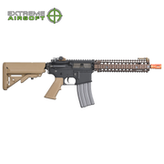 The MK18 Avalon VFC M4 AEG - with Daniel Defense rail system (licensed).  A fully licensed airsoft MK18 gun from Avalon / Elite Force with newly upgraded internal parts for 2019. This is a top of the line advanced MK18 carbine, full metal, the best parts, etc.  Upgraded small mosfet unit.  New Avalon ECS gearbox. Uses standard M4 magazines and accessories.  VFC made, extremely nice, and full metal rail system for accessories.  Flip-up integrated sights (metal) on the top rail too.  The rail system is that burnt bronze color that is super nice - and full metal.  This is a fantastic MK18 airsoft model
