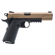 This 177 caliber Colt M45 CQBP with blowback is a variation of the 1911 Rail Gun that's enlisted by the U.S. Marine Corps. The M45 CQBP (Close Quarter Battle Pistol) by Umarex has a drop-free airgun magazine with a capacity of 19 rounds. Steel BBs are recommended for flawless function. They travel out of the smooth, metal barrel at a speed of 400 feet per second. The left grip plate removes for the loading of a 12 gram CO2 capsule and the mainspring slides out of the bottom of the grip frame to reveal a hex key for piercing the CO2 cartridge. Like the M45 issued to Marines as well as the commercial version, the Umarex model features the flat, desert-tan-color on a metal slide. The frame is a polycarbonate substrate with black poly grips. You'll also notice the under-barrel Picatinny rail, 3-dot sights of which the rear is adjustable for windage, flat serrated mainspring with lanyard loop, enhanced Commander-style hammer, long, solid trigger, and ambidextrous safety lock. For those familiar with the Colt M1911A1, physical handling of the M45 airgun is very similar. The airgun is manufactured to dimensional spec so that it fits duty holsters. The trigger pull comes in at 4.25 pounds. The trigger pull comes in at 4.25 pounds. The overall weight of this airgun is 1.75 pounds.