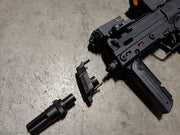 The PTS MP7 51T Flash Hider is made to PTS's superior quality standards with high-quality steel and a real steel finish that is scratch and weather-resistant like a real gun flash hider. It is compatible with the KWA MP7 GBB and the VFC MP7 AEG and will allow you to attach the PTS Mk18 mock suppressor to the MP7.