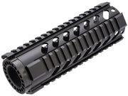 - Free float quad rail with Picatinny rail sections at the 12, 3, 6, and 9 o'clock positions
