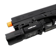 The Valken LED WeaponLite is the ultimate tactical light solution for pistols or rifles! A rugged yet lightweight aluminum light with mil-spec anodizing that produces 500 lumens of white LED light out to 150 meters for over an hour, the Valken WeaponLite tactical light can be securely mounted to either a pistol accessory rail beneath the barrel or to a Picatinny accessory rail on a rifle or carbine! The ambidextrous momentary-on or constant-on switch is easy to find and use and the light is o-ring sealed for all-weather reliability! Powered by two included CR123 batteries, the Valken LED WeaponLite is a reliable, bright, rugged and versatile tactical weapon light that is a must-have for ANY serious tactical loadout!