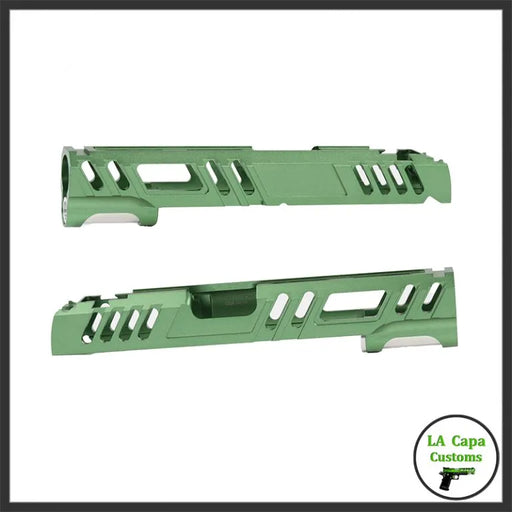 The LA Capa Customs 5.1 “HYPER” slide is truly one of a kind. It weighs under 49 grams and has a great mix of cutouts and depth to create an amazi...
