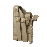 Innovative Ambidextrous Modular MOLLE Holster that is fully configurable for Full Size and Compact semi autos without or with tactical flashlights/lasers. With a Grid of Eyelets, this holster can be configured to fit various sizes and shapes of pistols. It can also be custom configured to fit around Tactical Flashlights/Lasers mounted onto the frame of the Pistol. With the use of the supplied tube spacers and bungee cords, the holster can be custom fitted to most Pistol without or with tactical flashlights and/or lasers. Included are three different types of retention features that can be used to keep the pistol secured to the holster: adjustable Thumb-Snap, Grip Retention Bungee Cord with pull tab, and 1" Nylon Grip Retention strap with quick connect buckles. With MOLLE webbing on both side this can be configured as a Left or Right handed holster. Feature also makes the Holster easy to attached to other MOLLE compatible gear. Includes two removable MOLLE straps with snap-button enclosure for attaching to MOLLE webbing. Includes 8 each optional rubber tube spacers, 2 each: bungee cords, cord locks, 1 each wooden stick tool for 1" Thumb Snap hook and loop height adjustments, 1" webbing w/snap button for holster muzzle stop