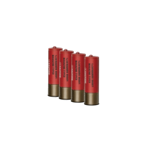 A set of four spare magazines for manual Airsoft shotguns. Each magazine looks like a real shotgun shell and holds 30 BBs.