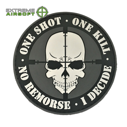 SPECIFICATIONSMATERIAL: PVC, VELCRO COLOR: GRAY FEATURES: IMAGES: CROSSHAIRS, SKULL TEXT: "ONE SHOT. ONE KILL. NO REMORSE. I DECIDE."