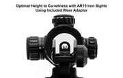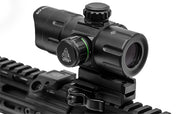 This Leapers UTG red/green sight provides instant target acquisition (ITA) with the help of a 4 MOA T-dot reticle for T-zone and center-mass targeting. With both red and green illuminated options and a wide range of brightness settings, users will be able to find the best background contrast for the situation. With a removable riser adaptor, offset and center height adjustments, users can find the best aim height and co-witness with iron sights. Unlimited eye relief helps shooters get on target quickly, and the Picatinny quick-detach, lever-lock mounting base allows for quick removal for fast tactical adaptability.