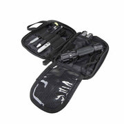 - Two zippers with cord zipper pulls and a small carry handle strap on the pack of the pouch.